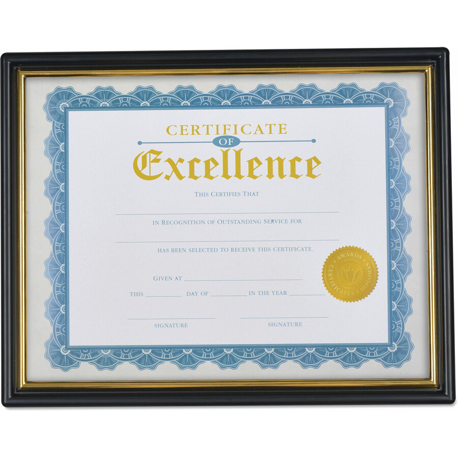 All-purpose document frames are a great value choice for framing multiple documents. Plastic frames with clear plastic inserts to keep documents free of dust and dirt. Perfect for documents, digital photos, diplomas, awards and certificates. Die-cut backing includes cut-outs for vertical or horizontal display. Frame Type: Certificate/Document; Photo; Frame Material: Plastic; Frame Color: Black/Gold Accent; Color Family: Black.